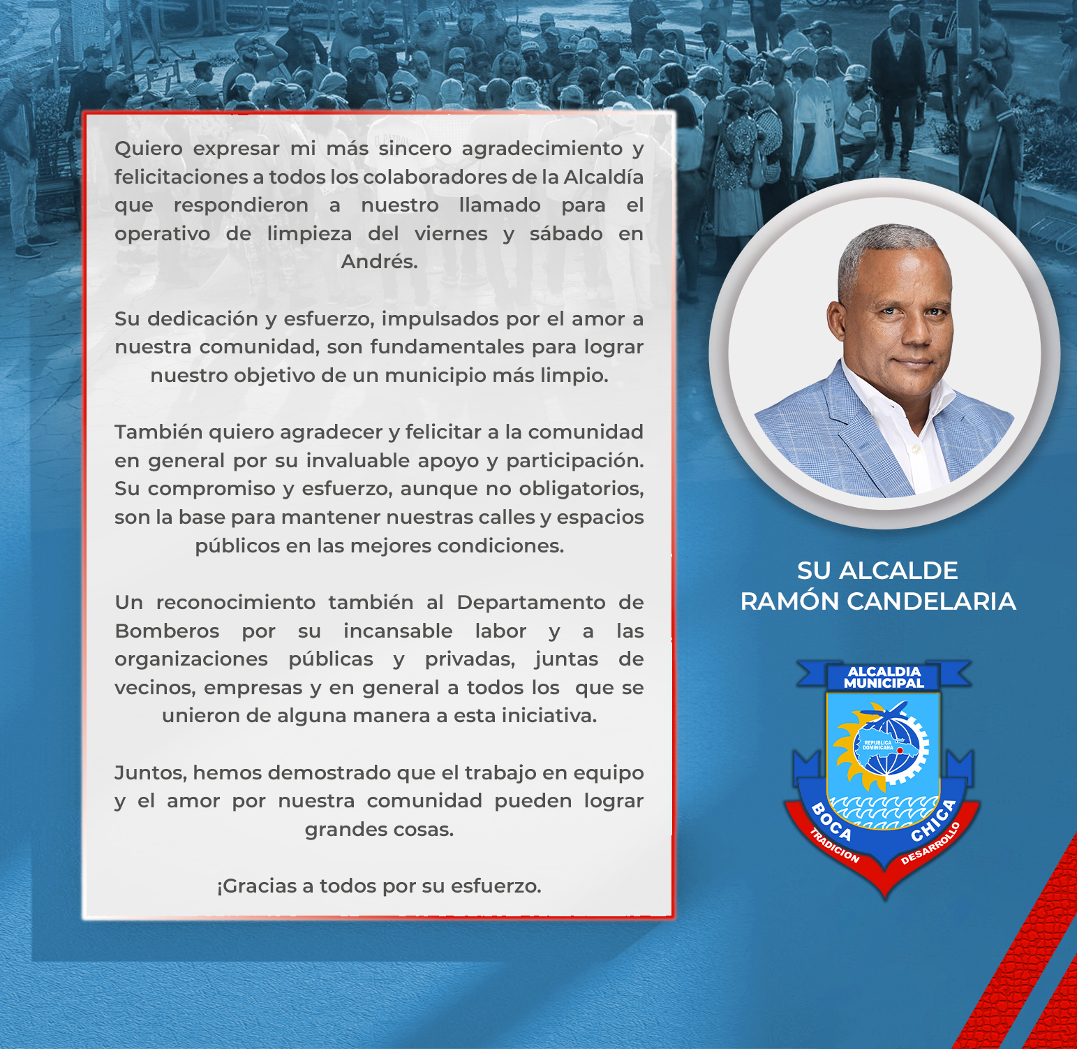 «Gracias infinitas a todos. Poco a poco lo lograremos, dando pasos firmes por amor a Boca Chica,» afirmó el Alcalde Candelaria, destacando la importancia de la colaboración comunitaria para mantener nuestro municipio limpio y seguro.