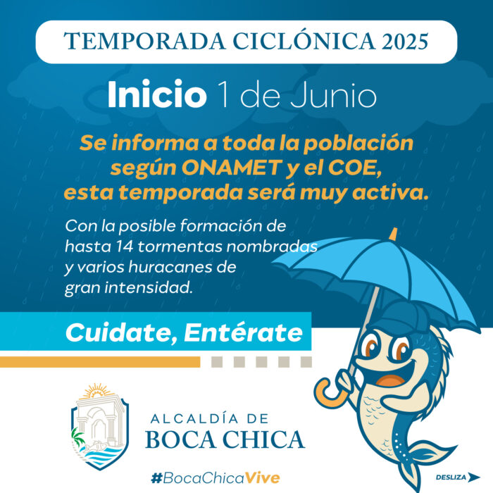 Se informa a toda la población de Boca Chica que, según ONAMET y el COE, esta temporada será muy activa. con la posible formación de hasta 14 tormentas nombradas y varios huracanes de gran intensidad.
